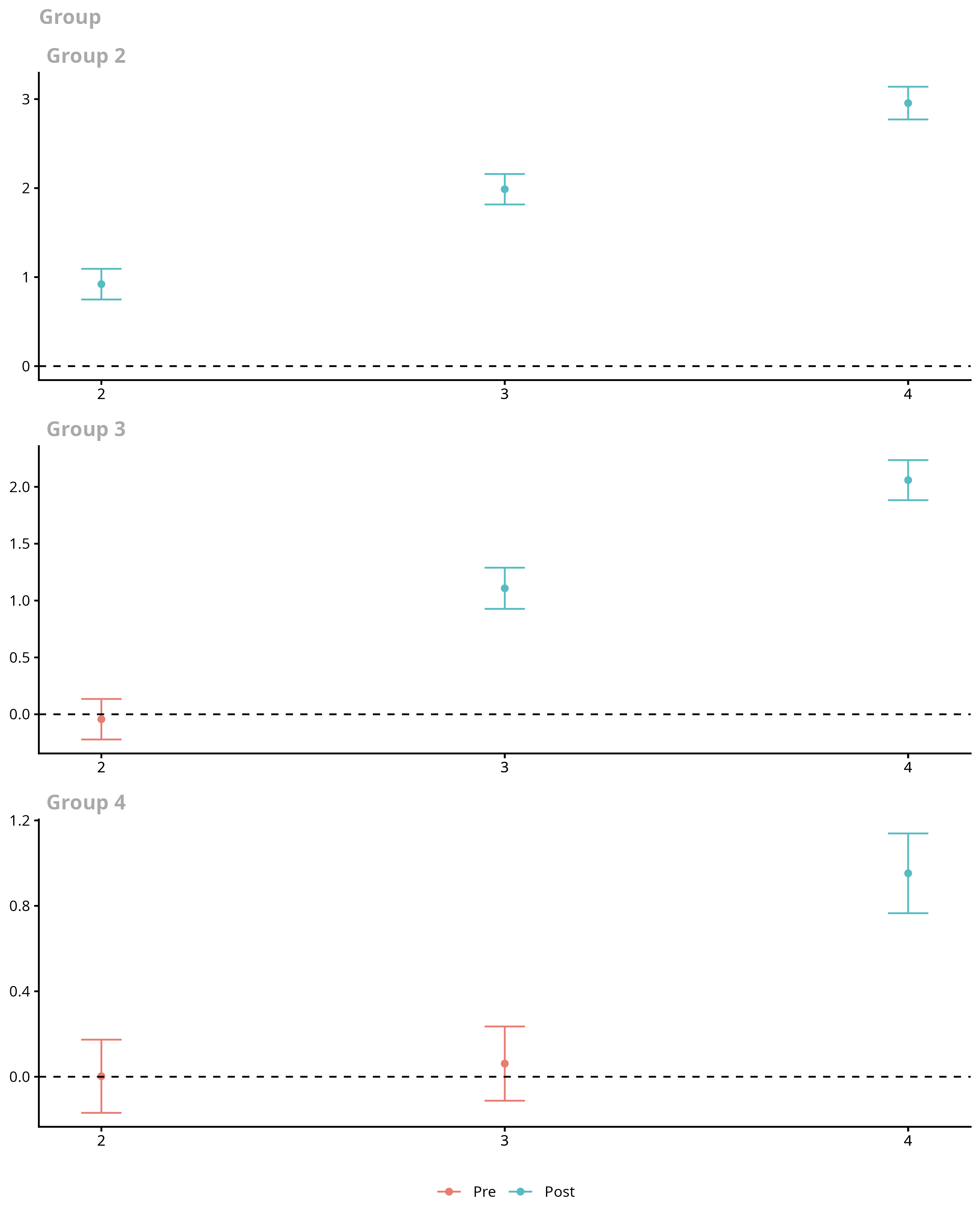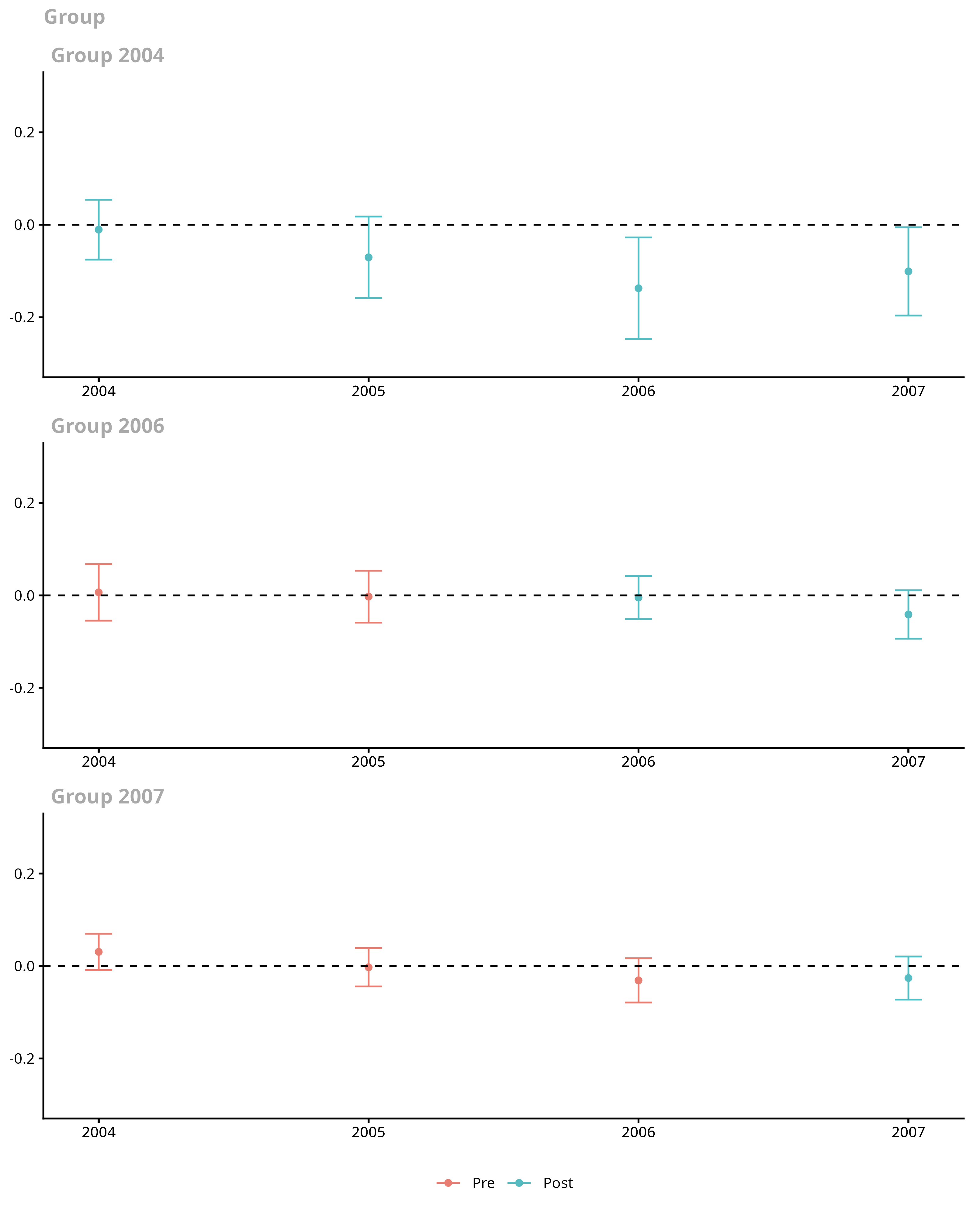 One potential issue with these dynamic effect estimators is that the composition of the groups changes with different lengths of exposure in the event study plots. For example, for the group of states who increased their minimum wage in 2007, we can only identify the instantaneous average effect of the minimum wage (), whereas for states that raised their minimum wage in 2004 (2006), we can identify the average effect of the minimum wage on event-times (). When computing the event-study plot for , we would aggregate the effects for all three groups, but this is not the case when . If the effects of the minimum wage are systematically different across groups (here, there is not much evidence of this as the effect for all groups seems to be close to 0 on impact and perhaps becoming more negative over time), then this can lead to confounding dynamics and selective treatment timing among different groups.