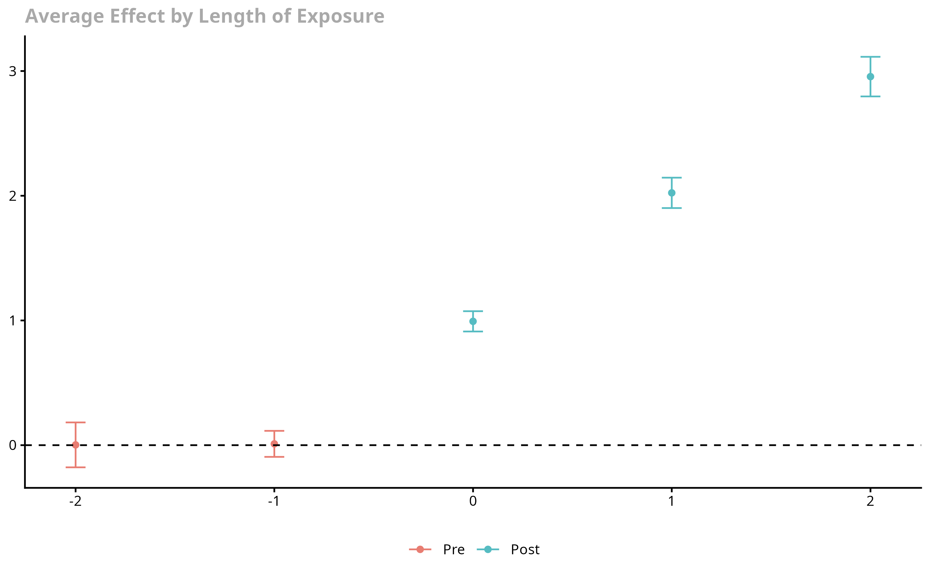 where is the event time (i.e., the difference between the current time period and the time when a unit becomes treated), and the last term just allows for the error terms to be different for treated and untreated potential outcomes. It immediately follows that, in this particular example, for all post-treatment periods .